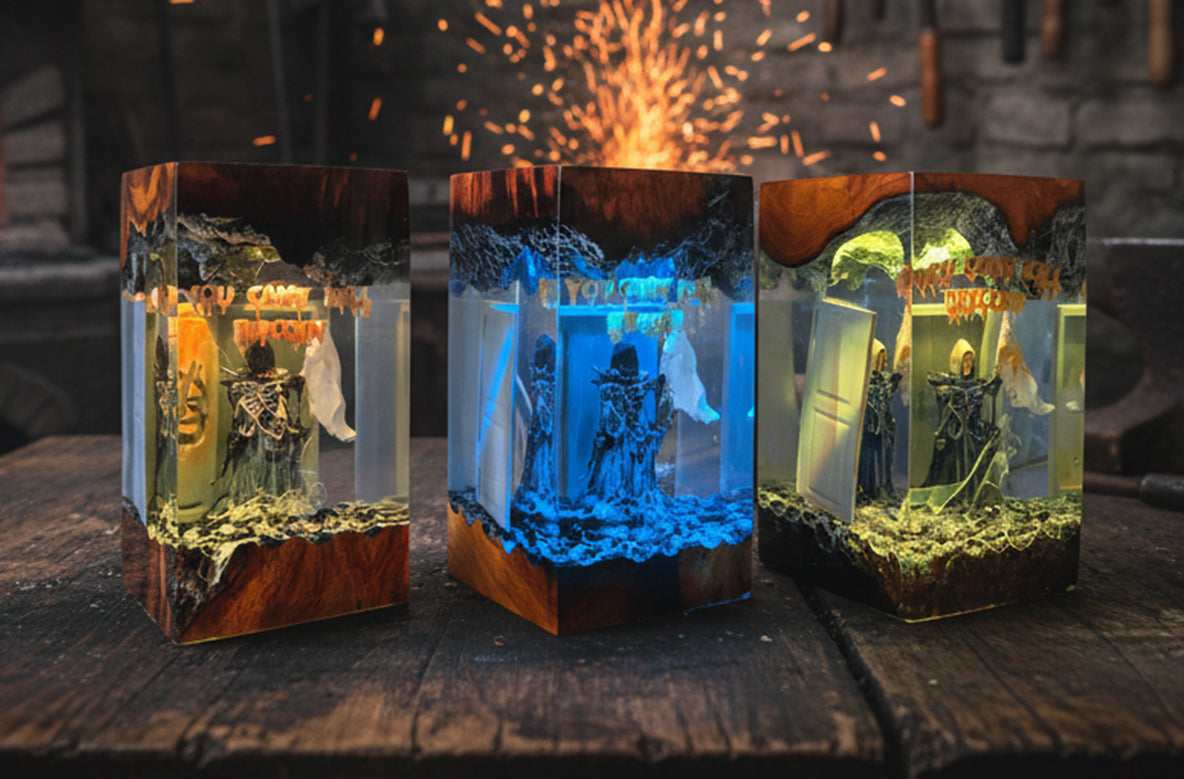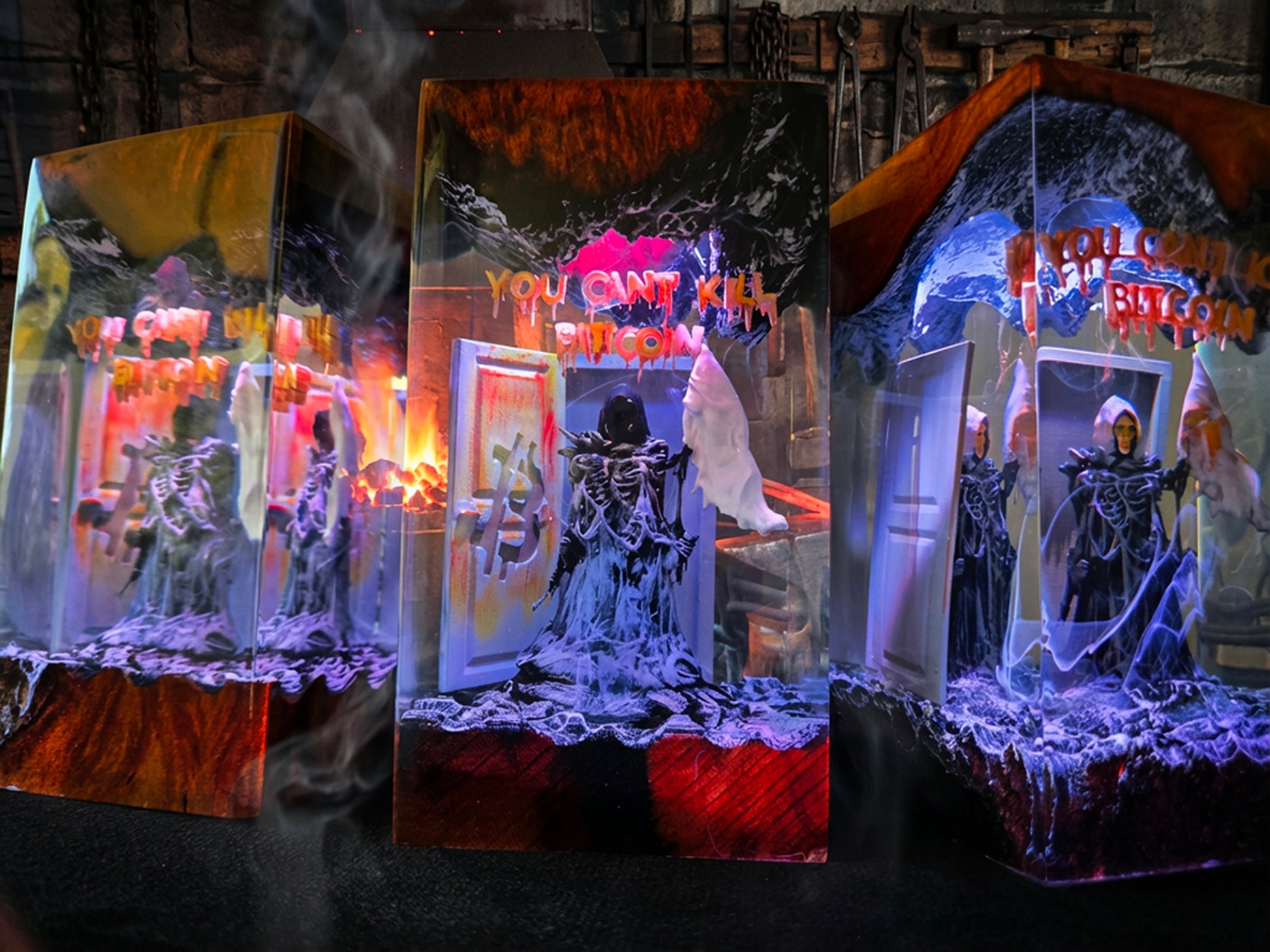 The model inside the resin is a unique 3D model created to replicate the Reaper in my "Reaper's Surrender" artwork. The meme is based on the never ending death of bitcoin and its inevitable survival. Eventually death itself raises the white flag to bitcoin.